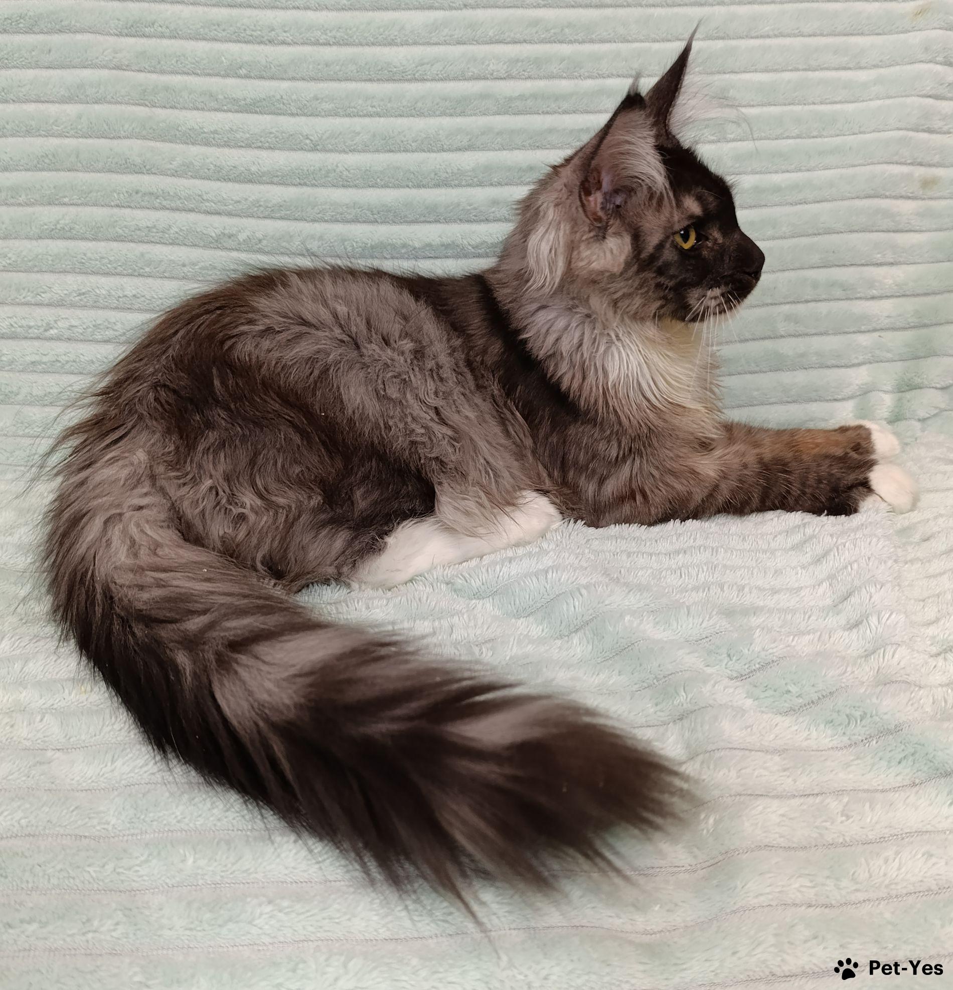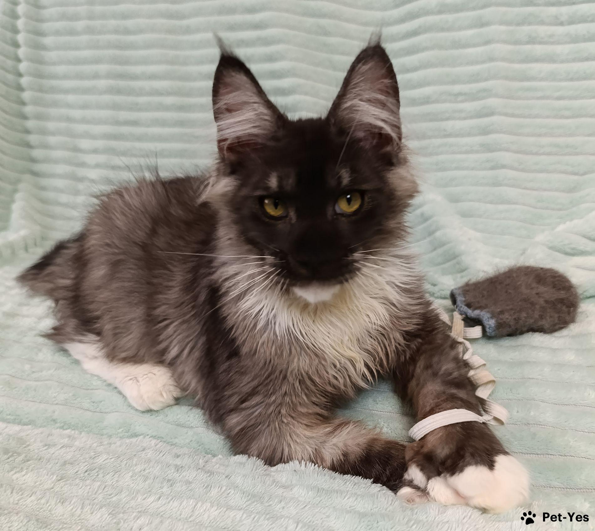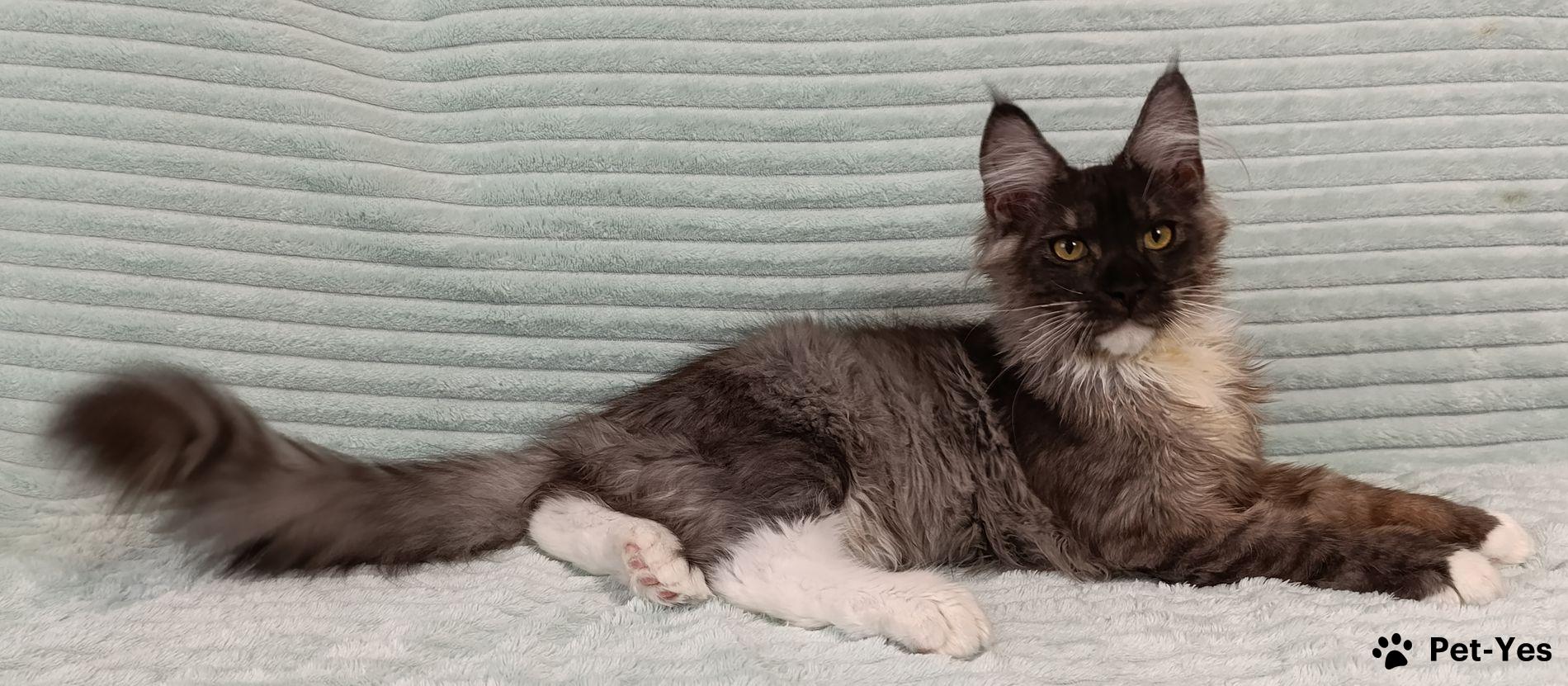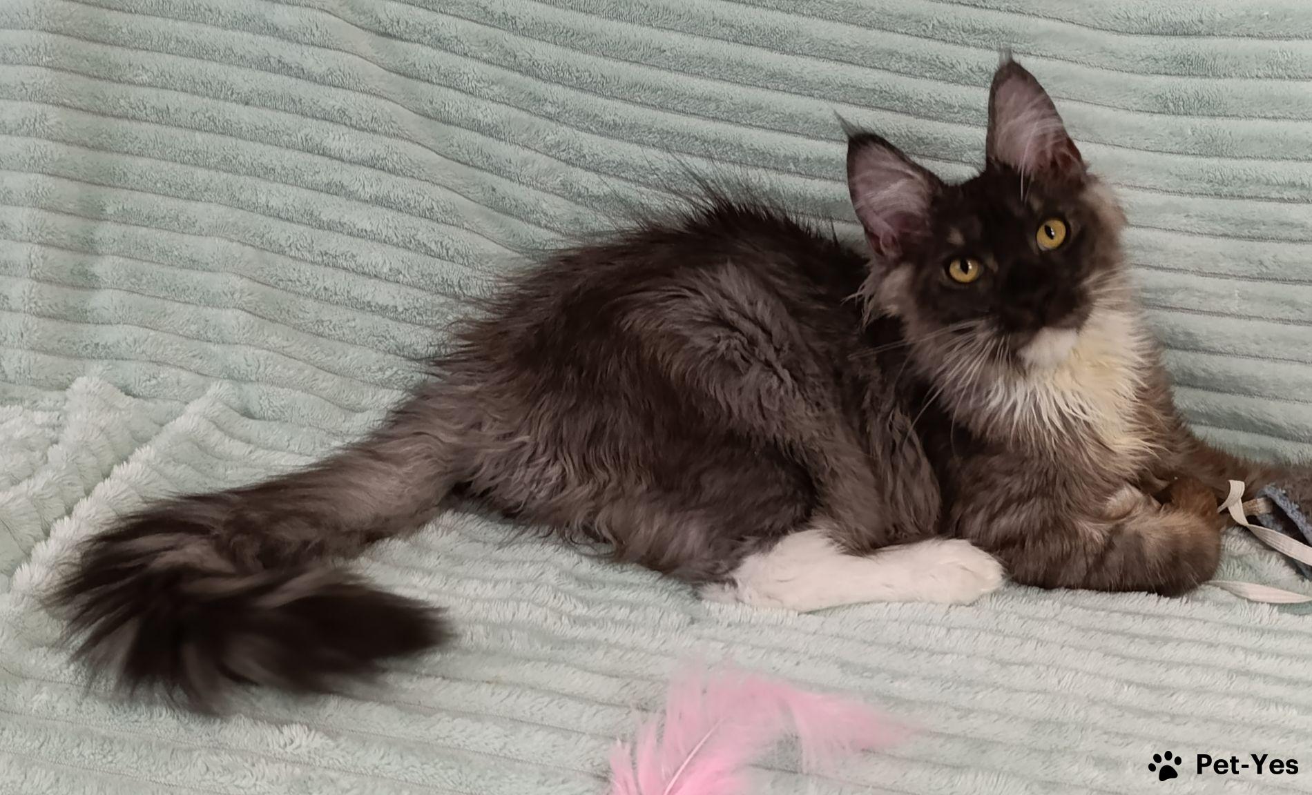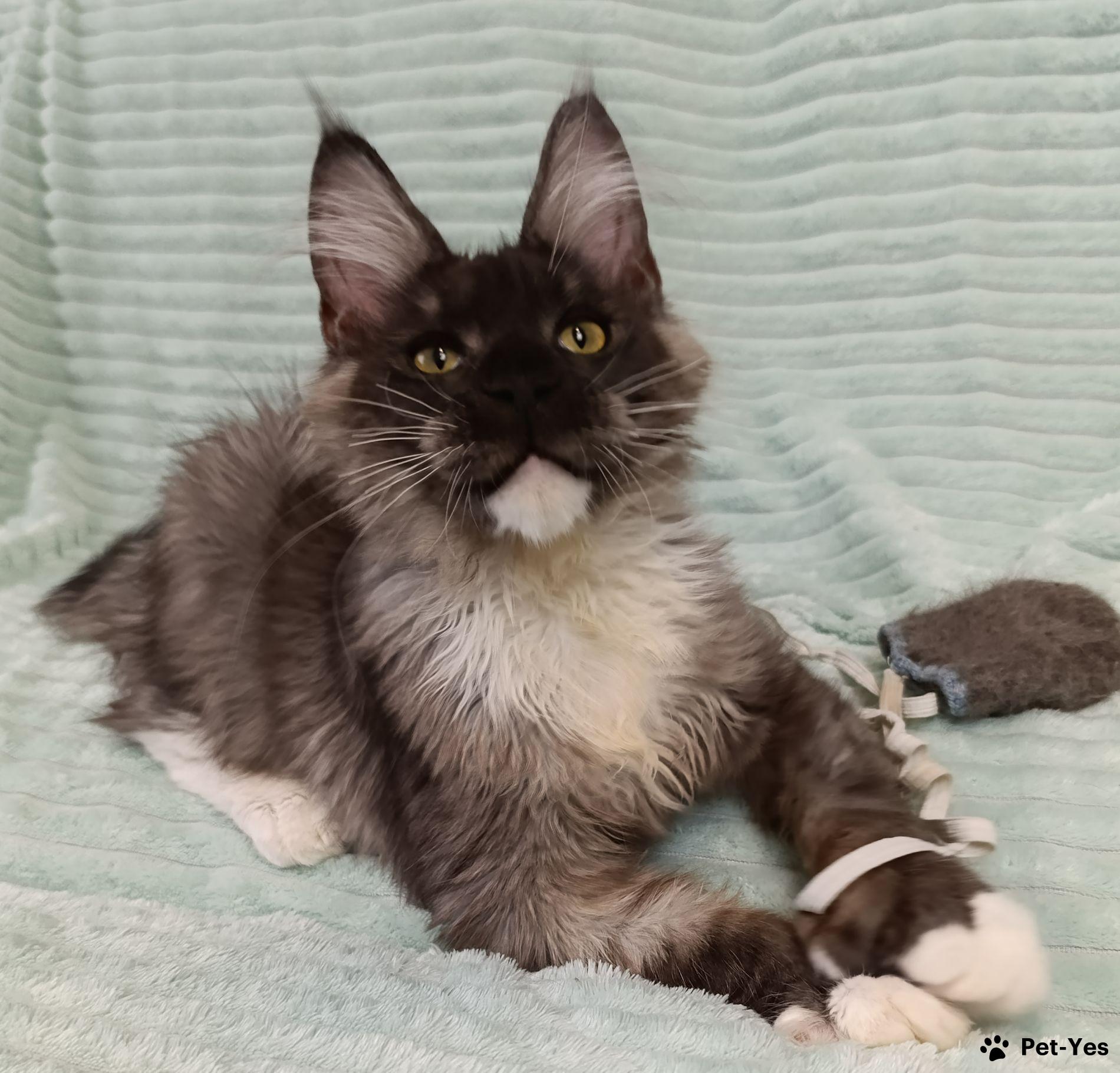 Огромный мальчик в 4 месяца уже весит 4 кг!! Хвост XXL ! Полилакт пальчики 77/66. Когтеточка и лоток на 5+ , в основе питания сухой и влажный корм. Растет в семье с ребенком, прекрасно социализирован, идеальная психика!! Есть доставка официально через РЖД при наличии прямого поезда из Санкт-Петербурга до Вашего города, в стоимость не входит.