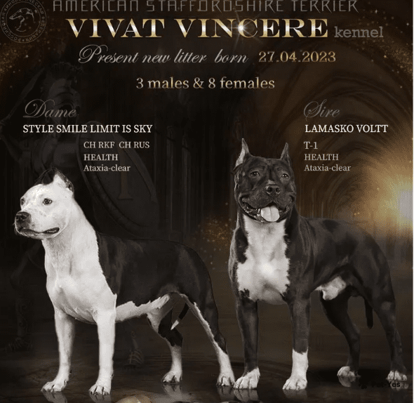 🔥Предлагаются щенки американского стаффордширского терьера, рожденные 27.04.2023 г. от титулованных родителей с устойчивой психикой и высокой обучаемостью. 👍 В родословной щенков собраны лучшие крови известнейших питомников и родоначальников породы. 👉 Малыши разных окрасов, с разным характером и темпераментом, подходят как для выставочной карьеры, так и в качестве домашних любимцев. 👉 У каждого щенка будет клеймо, а так же пакет документов: ✓ Приятный сюрприз (подарок), ✓ Метрика щенка/щенячья карточка (для обмена на родословную РКФ), ✓ Ветеринарный паспорт с отметками о ветмероприятиях, ✓ Договор купли-продажи щенка, ✓ Памятка по основным вопросам выращивания, ✓ Круглосуточная поддержка как в команде единомышленников, так и индивидуально, ✓ Возможность приобретать корма по выгодным ценам! На фото мама и папа щенков. Цены на щенков разные, условия оплаты гибкие. Родословные родителей, дополнительные фото и видео щенков и родителей - по запросу.