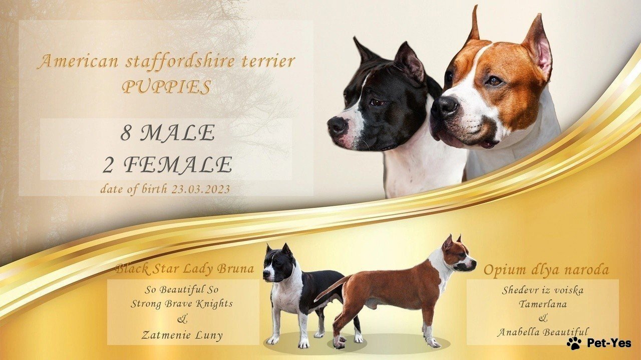 г. Воронеж Продаются щенки Американского стаффордширского терьера, д.р.23.03.2023г. От красивой пары чемпионов. Папа: Opium Dlya Naroda ЮЧР, ЮЧРКФ, продолжает выставочную карьеру Мама: Black Star Lady Bruna, ЮЧР 💥Доступны 5 кобелей окрасы: голубой с белым, черн-бел, голубо-палевый, рыж-бел, и 1 девочка рыж-бел окраса Генетически чисты от заболевания Атаксия(тесты родителей) ✅Документы РКФ ✅Клеймо ✅Ветпаспорт ✅Договор купли продажи ✅Подарок от питомника 🎁 Цены на щенков разные от 35т Доставку организуем в любой регион России!