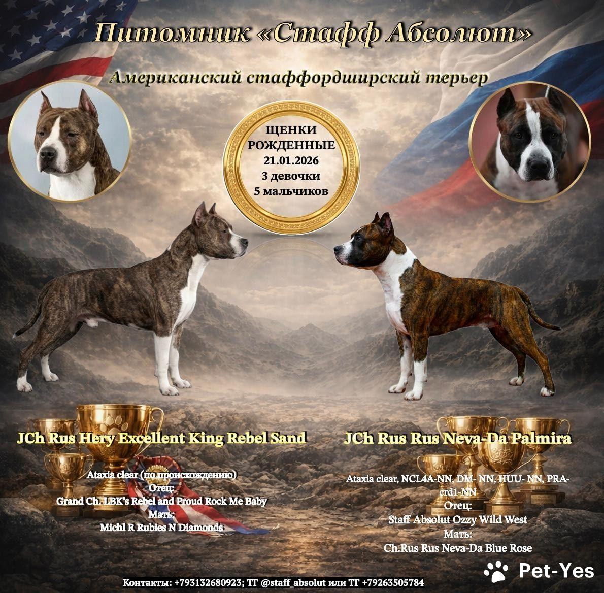 Представляем вам замечательную девочку породы Американский стаффордширский терьер с благородным тигровым окрасом. 🐾 Она родилась 21 января 2026 года 💝 Мама малышей редкого красно-тигрового окраса, чемпионка и может похвастаться родословной, собравшей в себе работу опытных отечественных заводчиков с большим стажем. 💙Отец щенков - великолепный тигровый кобель импортирован из Чехии, чемпион, его родословная представляет собою работу двух самых известных современных питомников США Родители максимально подобраны по схожести фенотипа и стандарту роста www.pedigreedatabase.com/american_s... ВК vk.ru/album710570383_31258... Вязка естественная, беременность без патологий, сука рожала сама, мертворождённых и отбракованных нет, щенки прошли актировку, содержание помёта совместно с комфортным проживанием семьи с детьми, щенки приучены к чистоте и режиму, гуляют. Атаксия — чисто у отца /личный тест получен/, чисто у матери щенков /4 личных теста по здоровью/. У обоих Т1 и юное чемпионство. Сука может представлять плем.интерес в удалённых от центра регионах. • 📄 документы РКФ • 📘 ветеринарный паспорт, обработки + Мультикан 8 • 🖋 договор • 🐾 клеймо и чип Поддержка заводчика и чат питомника: по выращиванию, воспитанию и содержанию.